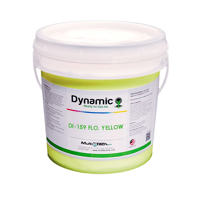 Dynamic Ink Fluorescent Yellow DI-159 RFU (Ready for Use) is one of the premier plastisol screen printing inks for manual and automatic screen printing machines. It offers good opacity for printing on 50/50 blends, cotton, and other fabrics. This low-cure ink, curing at 270–280°F, delivers bold, vibrant colors with a soft-hand print. It is creamy straight from the bucket, allowing you to go on-press quickly.