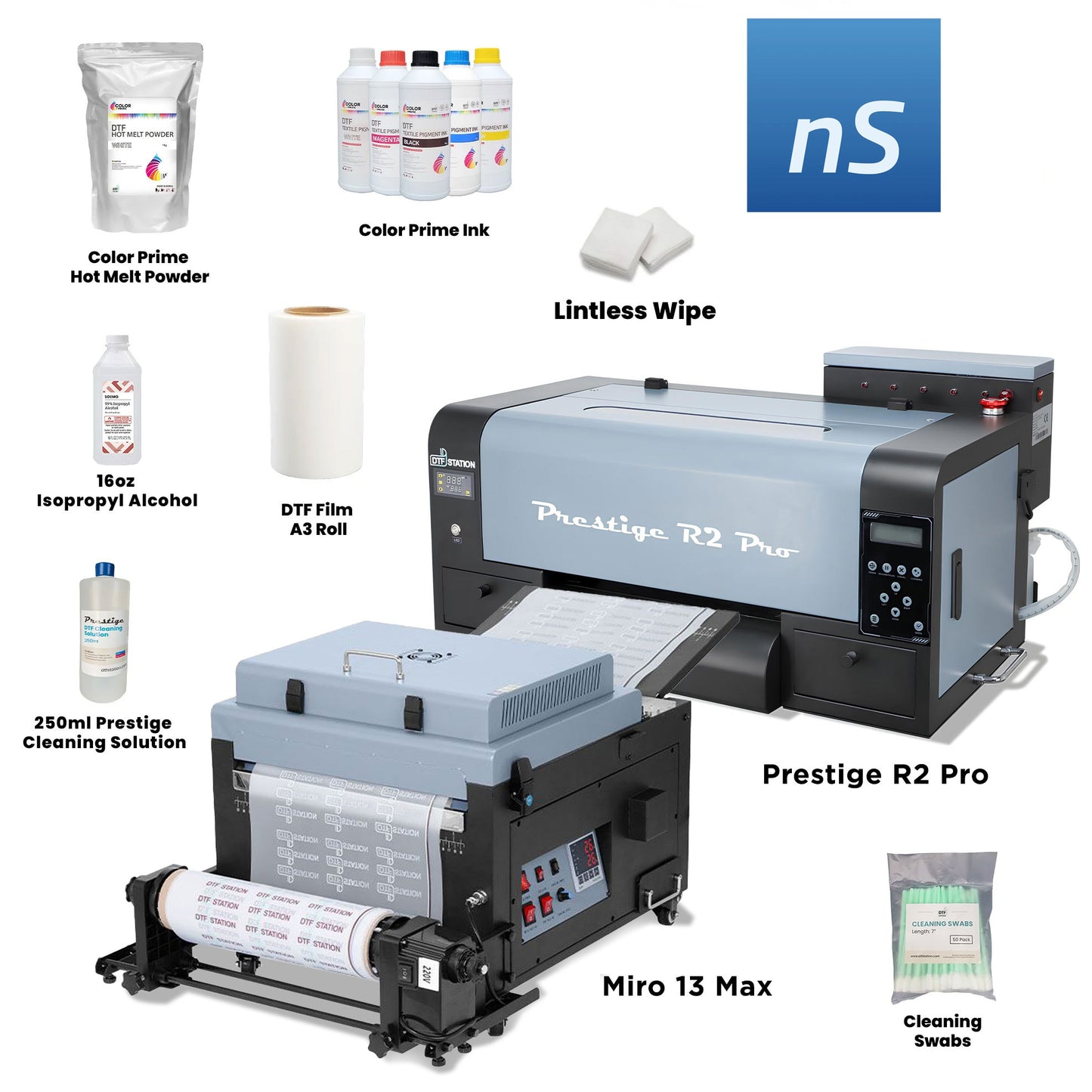 The Prestige R2 Pro DTF Printer Bundle provides a complete direct-to-film (DTF) printing solution, including the Prestige R2 Pro DTF Printer, a choice of Miro 13 Max or Seismo M16 DTF Powder Applicator and Dryer, and essential DTF supplies. This package streamlines your workflow for professional results in a compact setup.